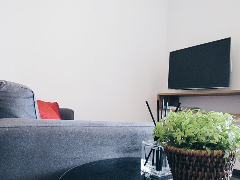 - Possui uma sala com um sofá, uma escrivaninha, duas cadeiras e uma smart tv de 32”; um quarto com uma cama de casal (box) com colchão de molas e uma smart tv de 32”; uma cozinha com geladeira frost free, cocktop e micro-ondas e uma área de serviço.
