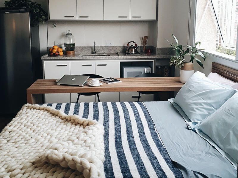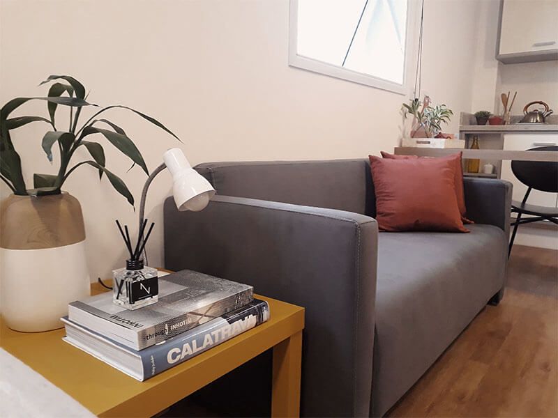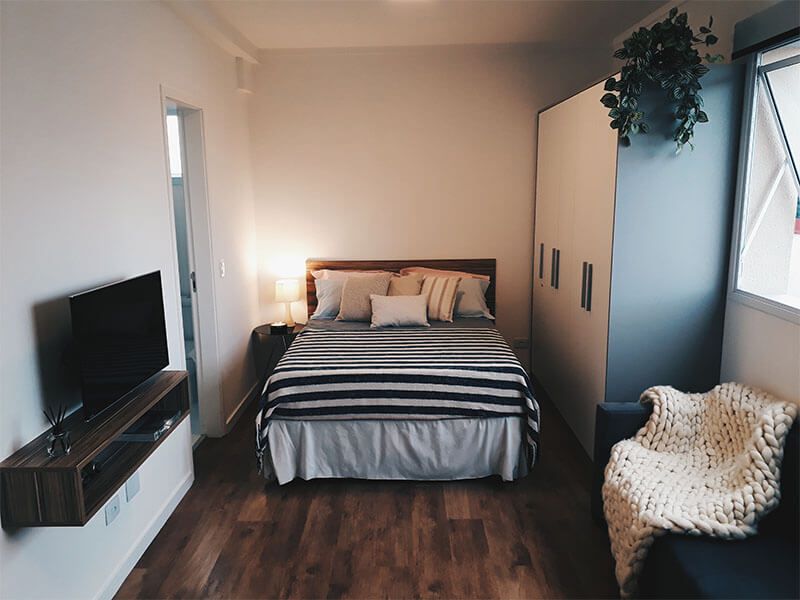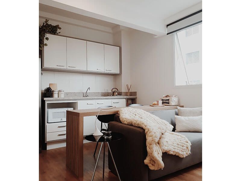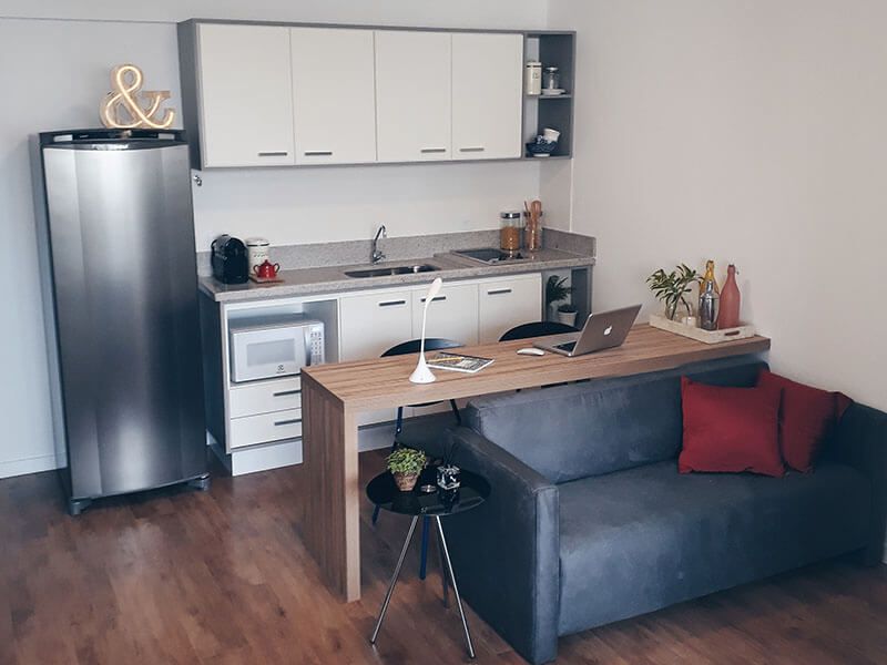 - Para o casal que quer mais conforto e privacidade sem abrir mão de praticidade, este studio mobiliado com até 30m² tem características de um apartamento de um dormitório.